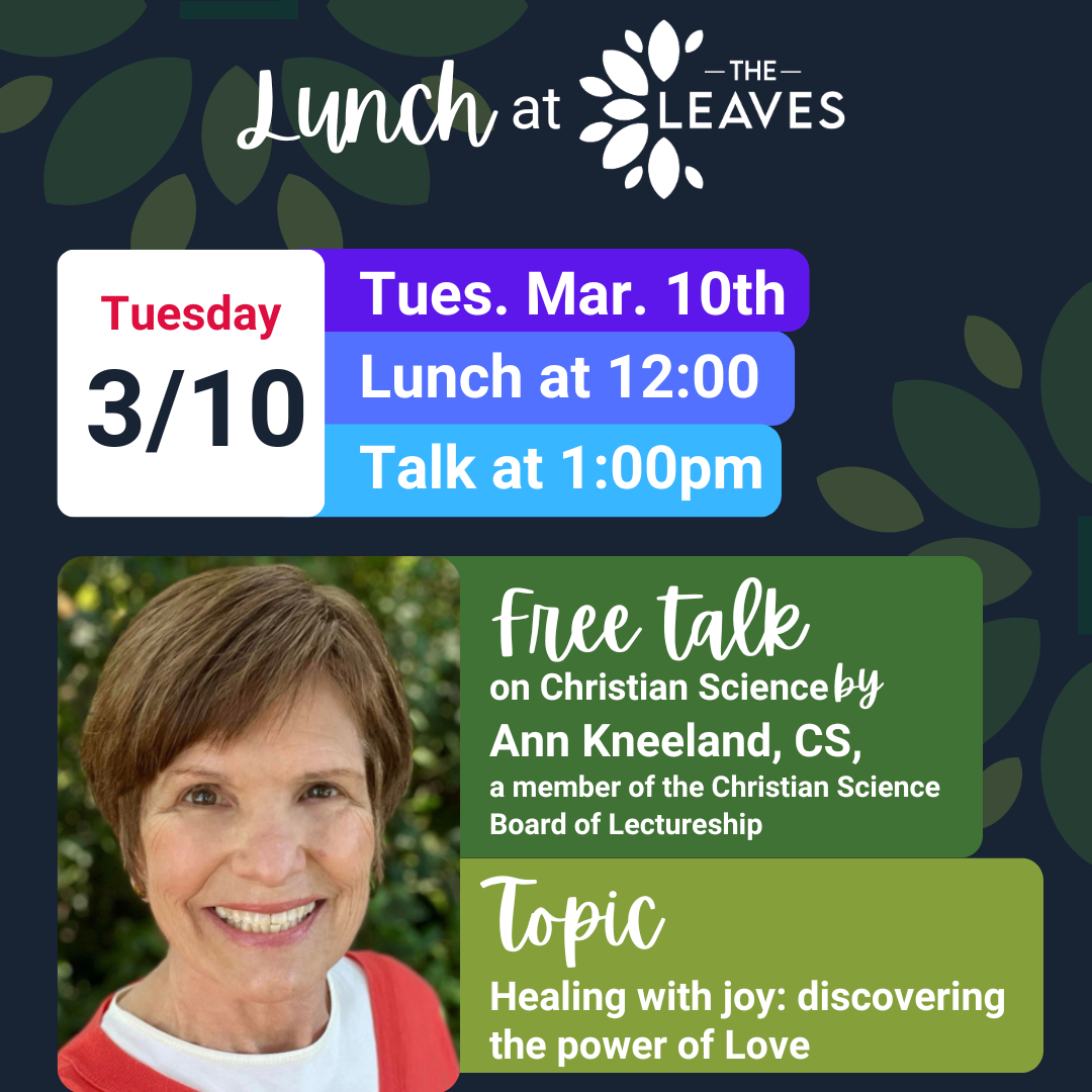 💡 1:00pm - Inspirational talk on Christian Science by Ann Kneeland, CS, a member of the Christian Science Board of Lectureship.